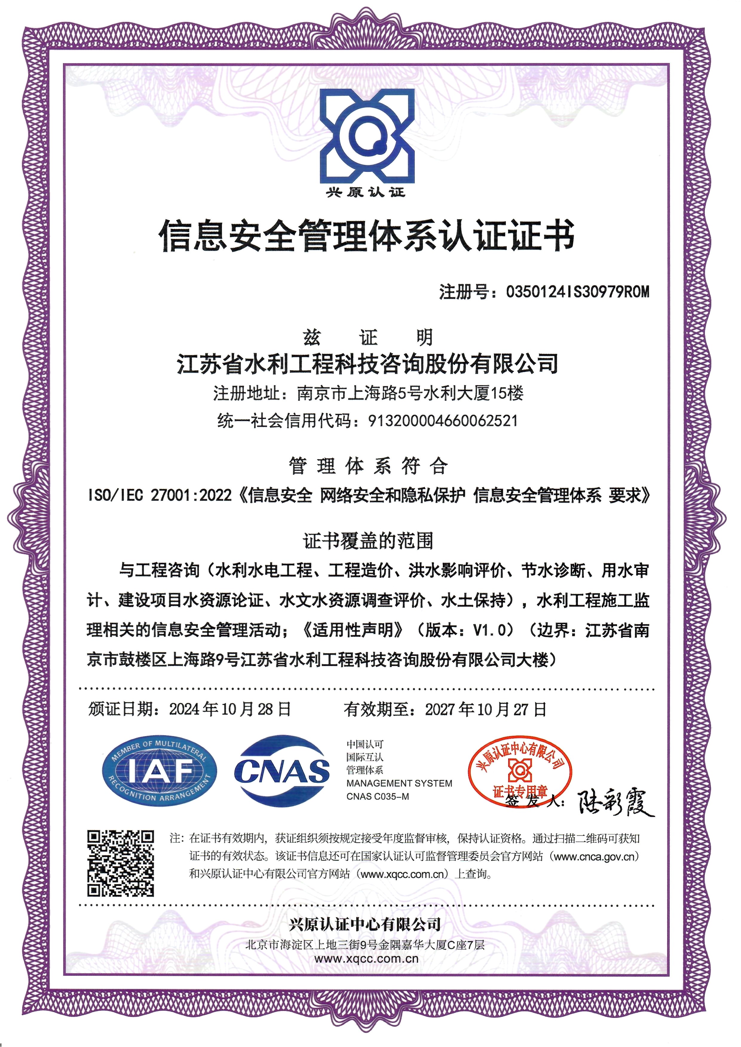 信息安全管理體系認(rèn)證證書