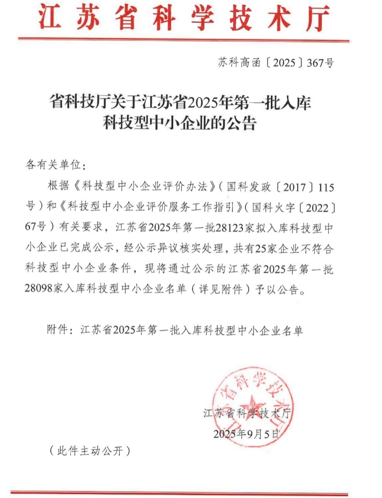 根據《省科技廳關于江蘇省2025年第一批入庫科技型中小企業(yè)的公告》(蘇科高函〔2025〕367號),我公司組織申報的2025年度全國科技型中小企業(yè)成功通過認定!