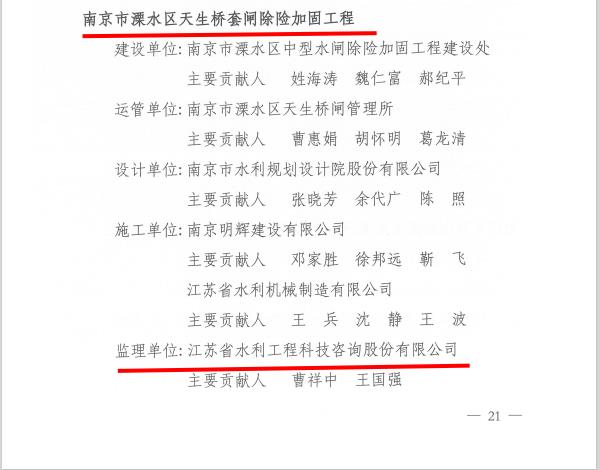 我司完成的世行貸款淮河流域重點(diǎn)平原洼地治理工程泰東河工程(技術(shù)咨詢)、南京市溧水區(qū)天生橋套閘除險(xiǎn)加固工程(建設(shè)監(jiān)理)喜獲2019—2020年度中國(guó)水利工程優(yōu)質(zhì)(大禹)獎(jiǎng)。