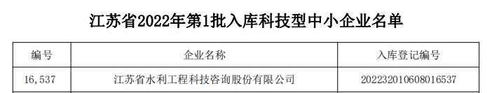 根據(jù)《科技型中小企業(yè)評價辦法》(國科發(fā)政〔2017〕115號),《關于做好2022年科技型中小企業(yè)評價服務工作的通知》(國科火字〔2022〕68號)等相關文件要求,我公司組織人力積極申報2022年度科技型中小企業(yè),經(jīng)過嚴格審查,成功入庫2022年度科技型中小企業(yè)。公司將不斷引入高端人才,提升企業(yè)自主創(chuàng)新能力,增強企業(yè)核心競爭力。同時積極拓寬科研領域,為企業(yè)更好、更快、更強的發(fā)展提供技術支撐,為江蘇水利科技發(fā)展貢獻應有的力量。