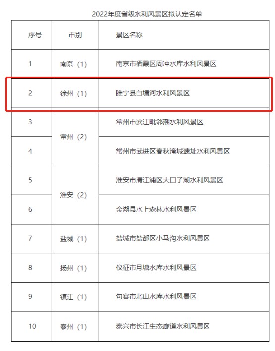 專家組通過(guò)查閱驗(yàn)收資料、線上查看現(xiàn)場(chǎng)、聽(tīng)取創(chuàng)建單位匯報(bào)、專家質(zhì)詢、集體評(píng)議,經(jīng)綜合評(píng)價(jià),認(rèn)為該景區(qū)符合省級(jí)水利風(fēng)景區(qū)認(rèn)定要求。2023年1月6日,省水利廳對(duì)2022年度省級(jí)水利風(fēng)景區(qū)擬認(rèn)定名單進(jìn)行公示,睢寧縣白塘河水利風(fēng)景區(qū)擬認(rèn)定為省級(jí)水利風(fēng)景區(qū)。
