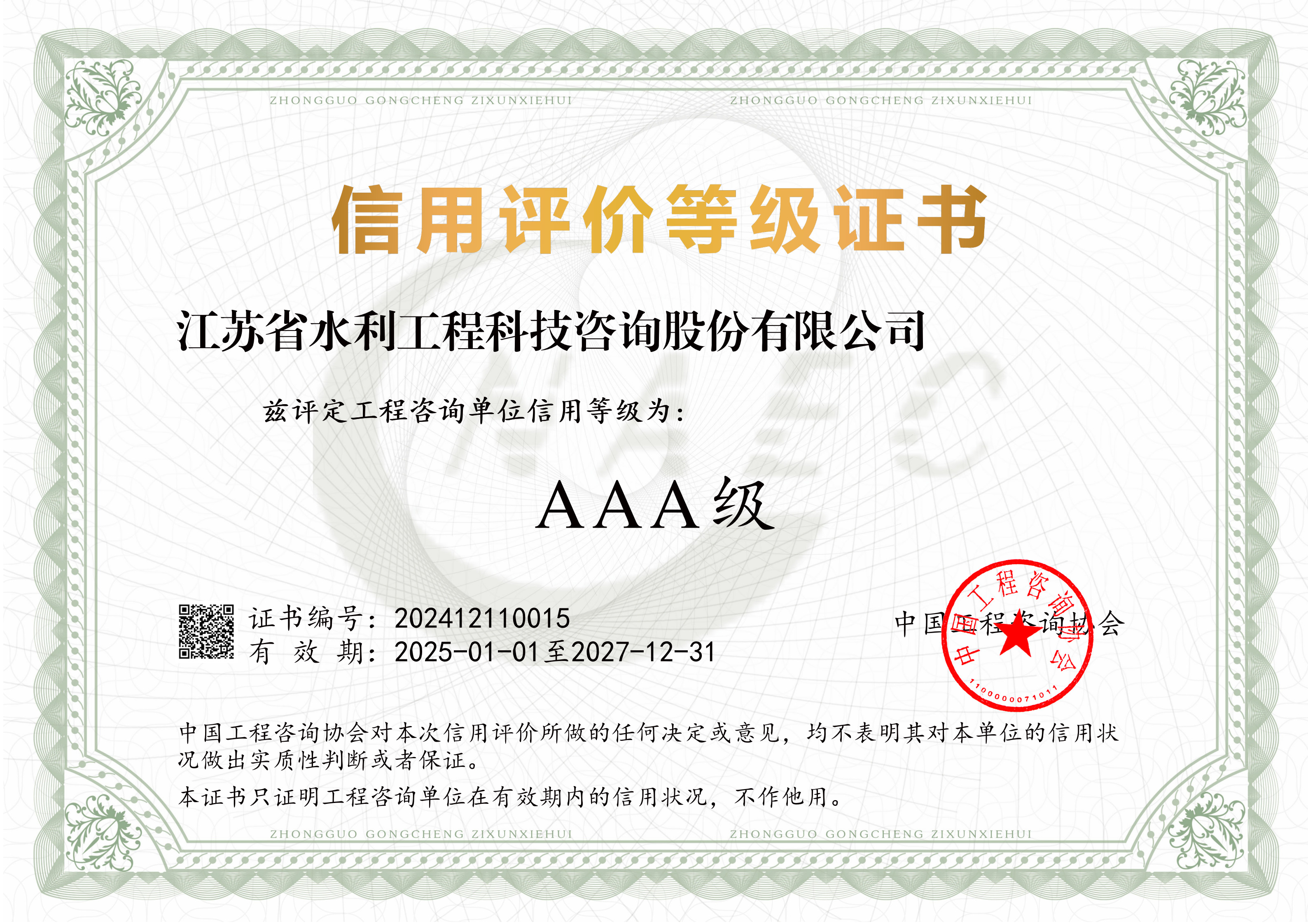 近日,中國(guó)工程咨詢協(xié)會(huì)公布2024年度中國(guó)工程咨詢單位信用評(píng)價(jià)工作結(jié)果(2025年第1號(hào)公告),我司榮獲工程咨詢單位信用評(píng)價(jià)最高等級(jí)“AAA”級(jí)。