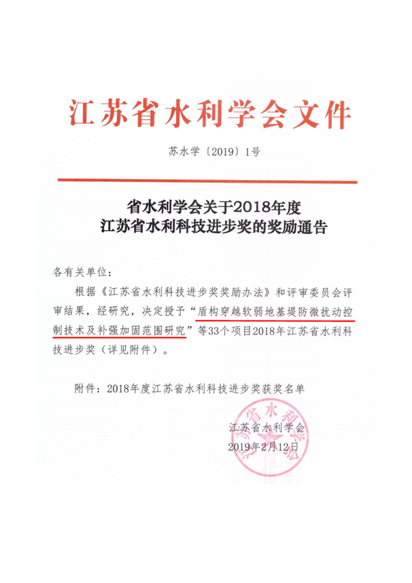 近期,我公司主持完成的《盾構(gòu)穿越軟弱地基堤防微擾動控制技術(shù)及補(bǔ)強(qiáng)加固范圍研究》喜獲2018年度江蘇省水利科技進(jìn)步一等獎。