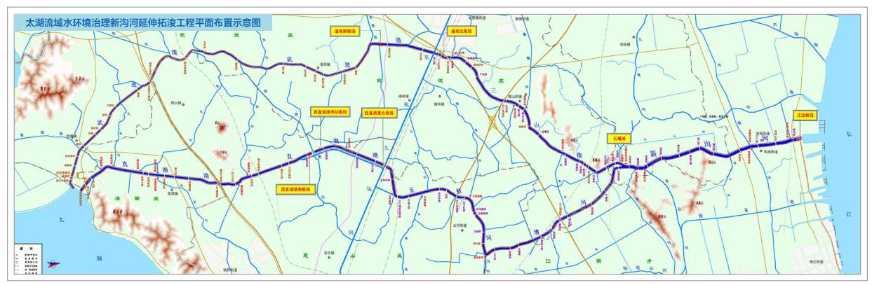 新溝河延伸拓浚工程(以下簡稱“新溝河工程”)位于常州、無錫兩市境內(nèi),沿線經(jīng)過無錫市濱湖區(qū)、惠山區(qū)和江陰市,常州市天寧區(qū)、新北區(qū)、武進區(qū)。工程主要建設(shè)內(nèi)容由河道延伸拓浚工程、堤防工程、護坡護岸工程、閘站樞紐工程、跨河橋梁工程、口門控制工程和水系調(diào)整工程等組成。其中河道延伸拓浚工程97.47km,新建和加固堤防111.84km,修建堤頂瀝青防汛道路83.35km,上堤道路3.15km,護坡護岸工程79.17km;修建閘站等樞紐建筑物8座,跨河橋梁105座,口門控制28處(其中封堵6處);水系調(diào)整工程河道疏浚59.14km,護坡、護岸6.81km,建設(shè)排澇、灌溉閘站25座,橋梁2座,排水管道500m。批復(fù)總投資56.4659億元。
