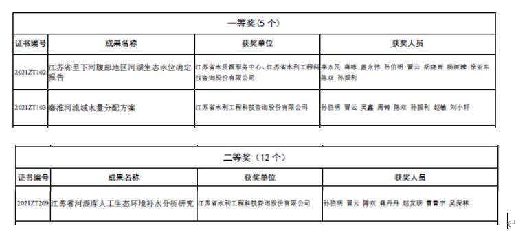 近日,“2021年度江蘇省優(yōu)秀水資源成果獎”揭曉,我司成果豐碩。我司編制的《秦淮河流域水量分配方案》、《江蘇省河湖庫人工生態(tài)環(huán)境補水分析研究》分別榮獲一等獎、二等獎,公司參與的《江蘇省里下河腹部地區(qū)河湖生態(tài)水位確定報告》獲一等獎。