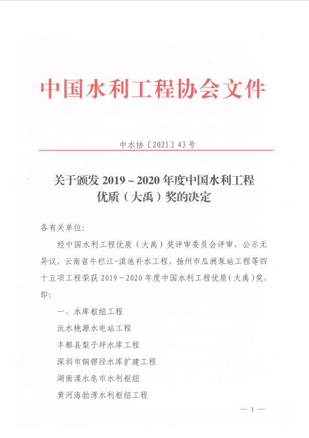 我司完成的世行貸款淮河流域重點(diǎn)平原洼地治理工程泰東河工程(技術(shù)咨詢)、南京市溧水區(qū)天生橋套閘除險(xiǎn)加固工程(建設(shè)監(jiān)理)喜獲2019—2020年度中國(guó)水利工程優(yōu)質(zhì)(大禹)獎(jiǎng)。