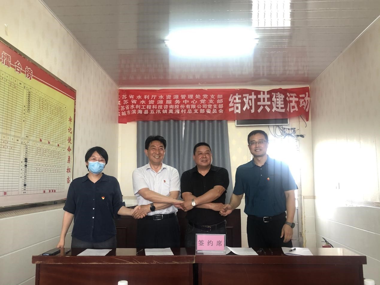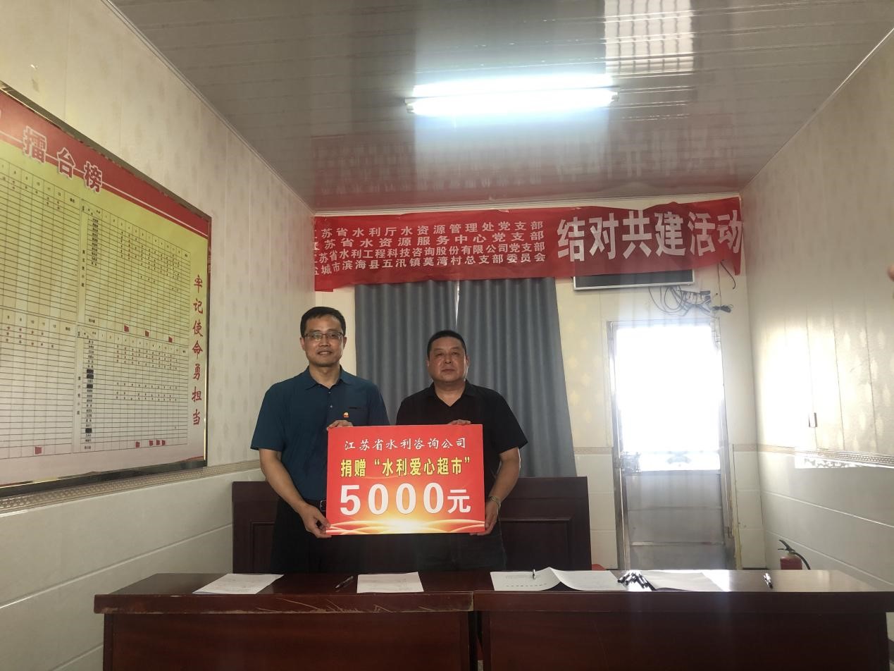6月23日,公司黨支部書記、董事長(zhǎng)兼總經(jīng)理顏紅勤與省水資源服務(wù)中心黨支部書記、主任李太民、廳水資源處副處長(zhǎng)游洋共同帶領(lǐng)相關(guān)工作人員,前往濱海縣五汛鎮(zhèn)莫灣村開展支部共建共融活動(dòng),以實(shí)際行動(dòng)助力鄉(xiāng)村振興。 本次活動(dòng)以加強(qiáng)支部共建共融為主題,在交流座談會(huì)上,共建四方分別介紹了支部黨建情況,協(xié)商了支部共建重點(diǎn)工作,提出了共建目標(biāo)與具體方案。  顏紅勤表示在交流座談會(huì)上,共建是各方相互學(xué)習(xí)的重要途徑,我們將全力支持4個(gè)支部共建共融活動(dòng),以黨建促媒介,以共建為橋梁,充分發(fā)揮水利咨詢單位的資源優(yōu)勢(shì),配合莫灣村在完善村莊規(guī)劃布局、智慧生態(tài)農(nóng)業(yè)建設(shè)等方面進(jìn)行綜合規(guī)劃,用實(shí)際行動(dòng)為莫灣村建設(shè)作貢獻(xiàn)。 座談會(huì)上,我公司向莫灣村捐贈(zèng)了扶貧款兩萬元,同向莫灣村“水利愛心超市”捐贈(zèng)了五千元愛心基金,助力莫灣村鄉(xiāng)村生態(tài)文明建設(shè)。