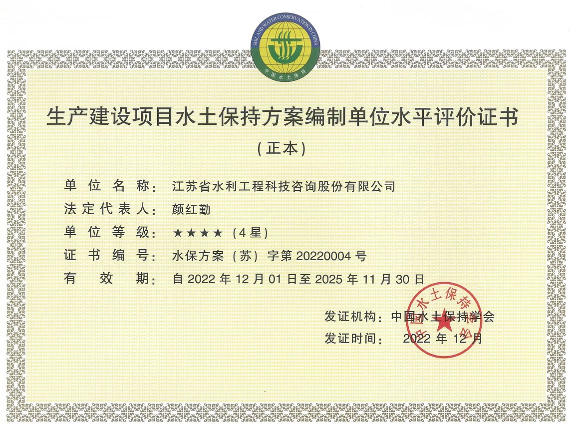 2022年12月,經(jīng)中國(guó)水土保持學(xué)會(huì)評(píng)定,我公司獲得生產(chǎn)建設(shè)項(xiàng)目水土保持方案編制單位水平評(píng)價(jià)四星、生產(chǎn)建設(shè)項(xiàng)目水土保持監(jiān)測(cè)單位水平評(píng)價(jià)四星。